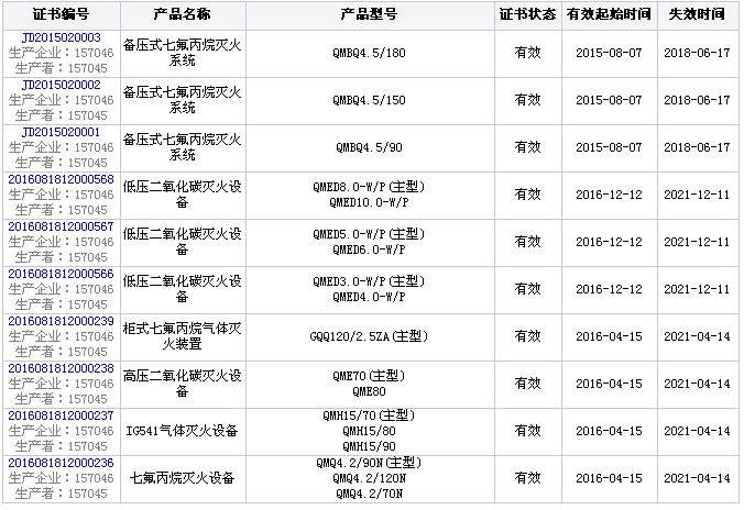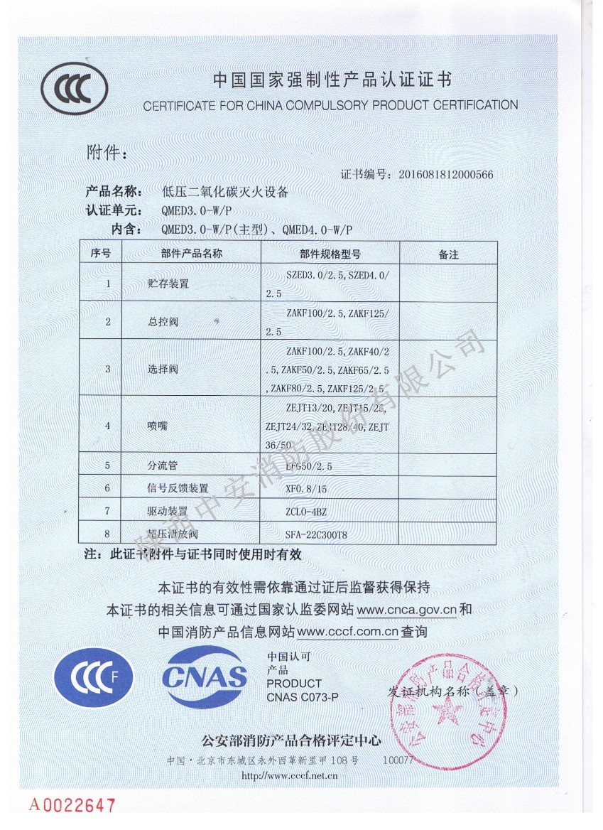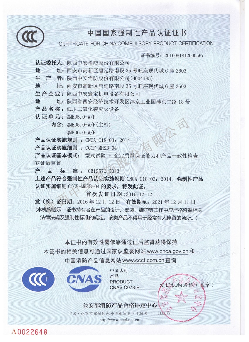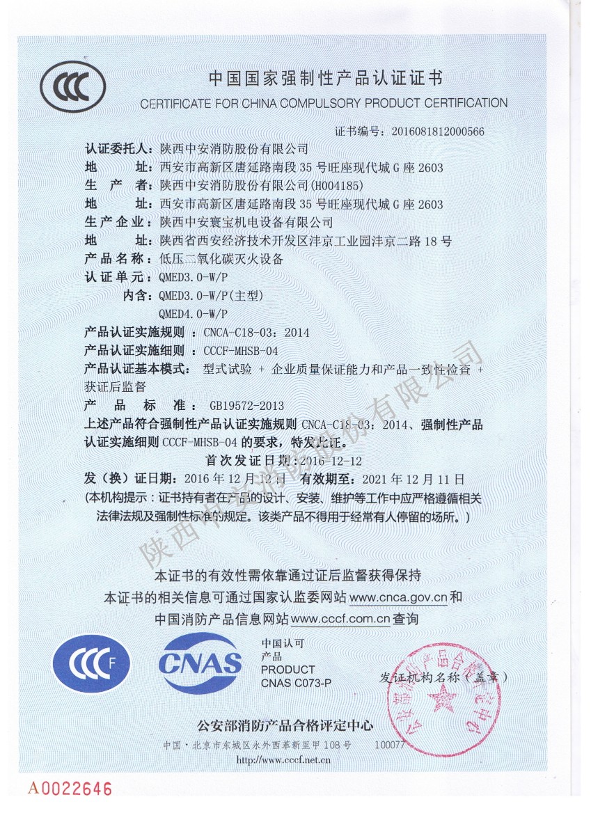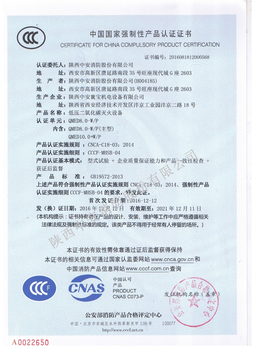 2016年12月13日,陜西中安消防集團山西名牌產品的低壓二氧化碳滅火設備取得3C證書,具體情況如下: