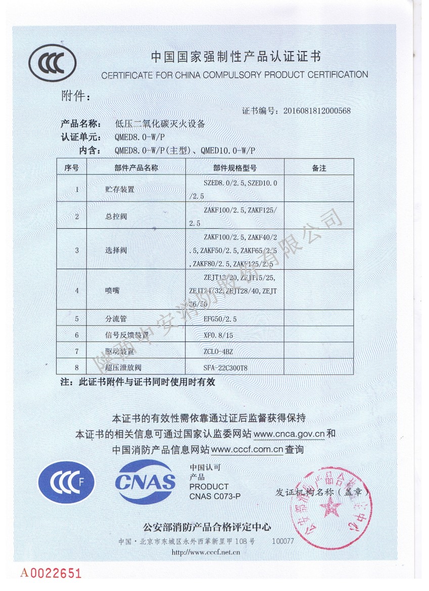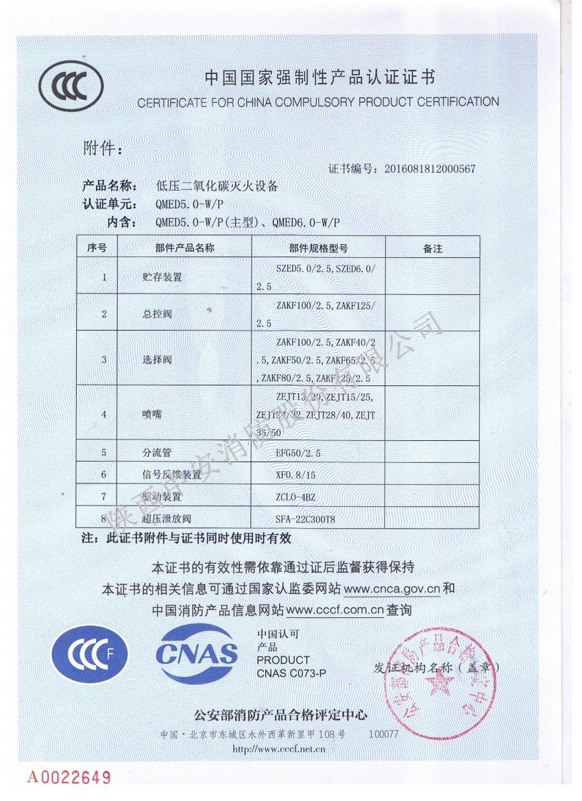 我公司順利取得低壓二氧化碳滅火設備3C證書